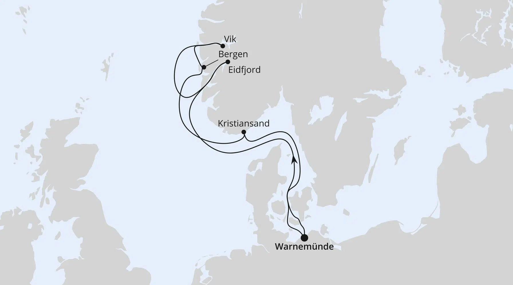 Warnemünde – Seetag – Kristiansand – Bergen – Vik – Eidfjord – Seetag – Warnemünde