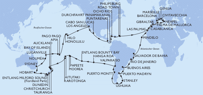 🌐 Die komplette Route der MSC Weltreise 2027