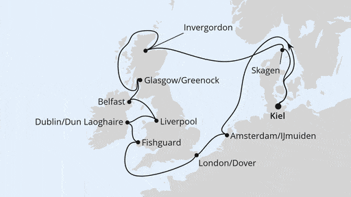 Kiel – Seetag – Ijmuiden – Dover – Seetag – Fishguard – Dun Laoghaire – Liverpool – Belfast – Greenock – Seetag – Invergordon – Seetag – Skagen – Kiel
