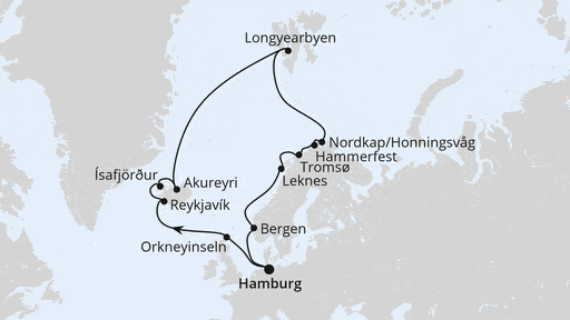 Hamburg – Seetag – Kirkwall – 2 Seetage – Reykjavik – Isfjördur – Akureyri – 2 Seetage – Longyearbyen (2 Tage) – Honningsvag (über Nacht) – Hammerfest – Tromsö – Leknes – Seetag – Bergen – Seetag – Hamburg