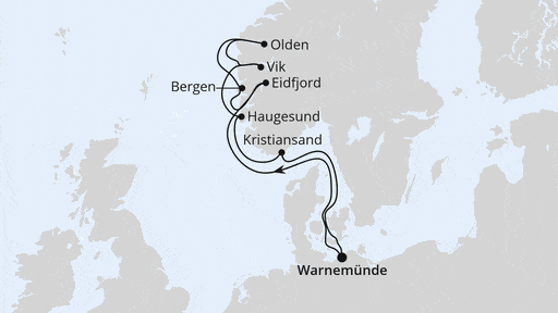 Warnemünde – Seetag – Eidfjord – Bergen – Olden – Vik – Haugesund – Kristiansand – Seetag – Warnemünde