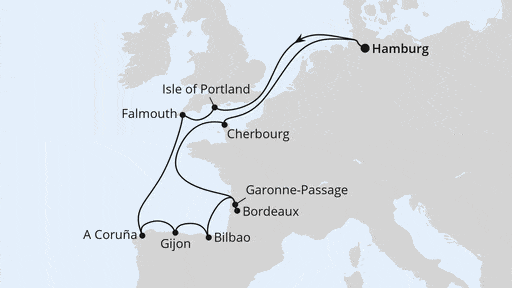 Hamburg – Seetag – Isle of Portland – Falmouth – Seetag – A Coruna – Gijon – Bilbao – Bordeaux – Garonne-Passage – Seetag – Cherbourg – Seetag – Hamburg