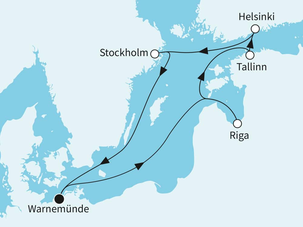 Warnemünde – Seetag – Riga – Seetag – Tallinn – Helsinki – Stockholm – Seetag – Warnemümde