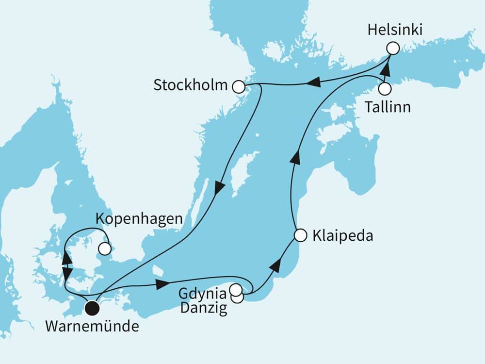 Warnemünde – Kopenhagen – Seetag – Gdynia – Klaipeda – Seetag – Tallinn – Helsinki – Stockholm – Seetag – Warnemünde