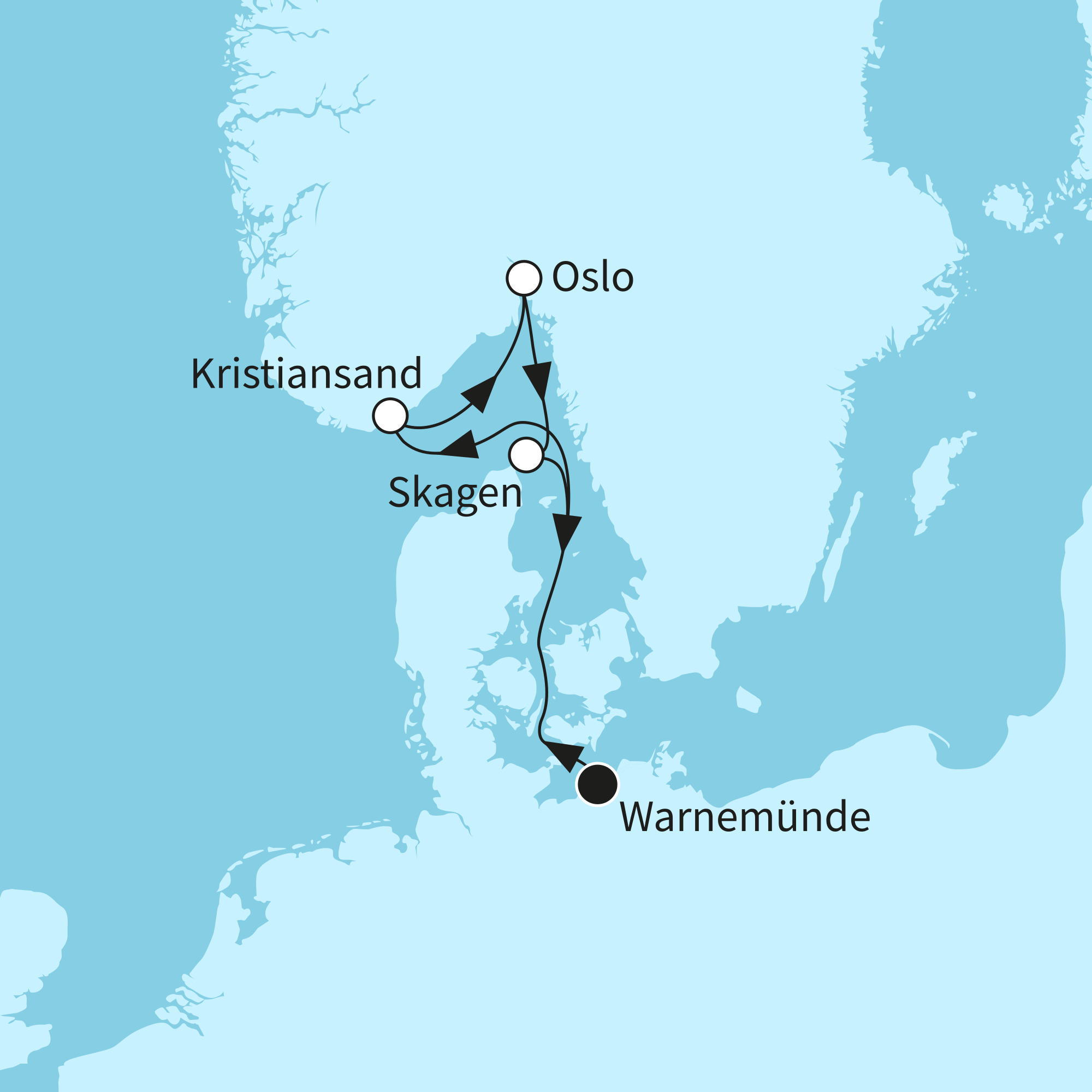 Warnemünde > Seetag > Kristiansand > Oslo (Oslofjord) > Skagen > Seetag > Warnemünde